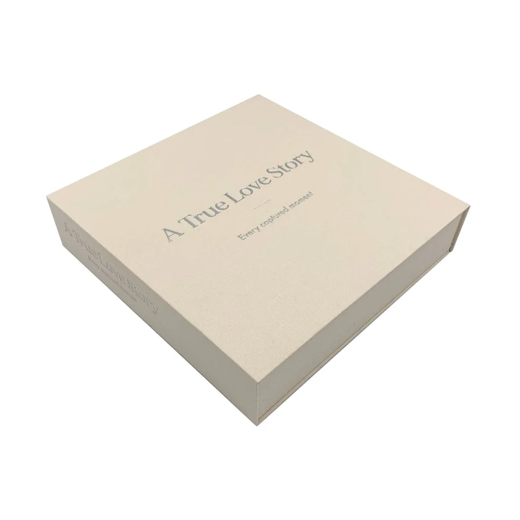 This modern album comes presented in an archival quality, fine linen cream fabric which is lightly textured giving an understated elegant feel. The words "A True Love" and "Every captured moment" printed on the cover and the spine are delicately embossed with a silver foil.